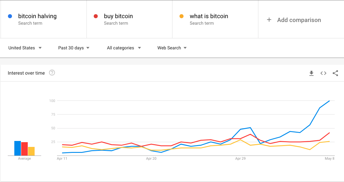 The trend is not exclusive to China. Across the globe Google search interest around terms like “Bitcoin halving,” “Buy Bitcoin,” and “what is Bitcoin” has catapulted, leaving Bitcoiners even more bullish ahead of the halving.