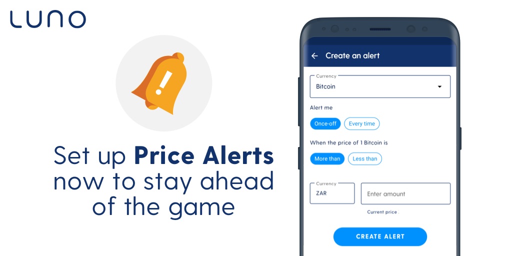 Price alerts simply notify you when the price of your selected crypto reaches a certain level. You’ll receive a push notification from your Luno app or, if you’re not logged into the app, via email.
