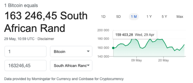 There are also exchange rates to consider. Customers from our countries of operation sometimes search for the price of Bitcoin in their home currency: South African Rand (ZAR) or Nigerian naira (NGN), for example. If you search for “1 BTC to ZAR”, for instance, Google shows you the estimated exchange rate of 1 BTC in US Dollars, as indicated on Coinbase at that moment, with the US Dollar amount converted into ZAR. Even if you had US Dollars in a Coinbase account, the price you’d pay would be different to the one shown on Google, due to fees and other variables.