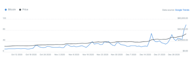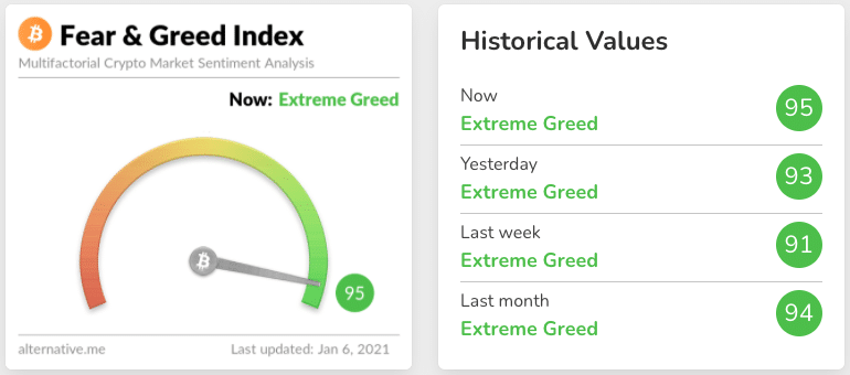 Unsurprisingly, the sentiment remains in Extreme Greed territory and is back up to 95 from 93 yesterday. The last time the sentiment was not in Extreme Greed was 5 November, 2020. The price of one bitcoin on that day was $15,706.40.