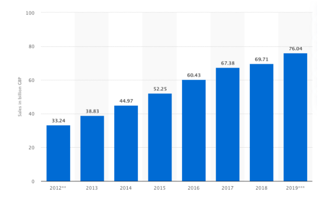 (Above: Value of online retail sales in the United Kingdom (UK) from 2012 to 2019 (in billion GBP), Statista)