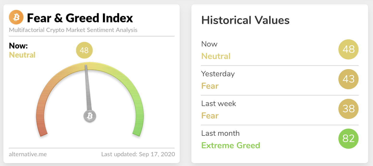 With more upwards price action, sentiment is up again from 43 to 48 – its highest level since 3 September.