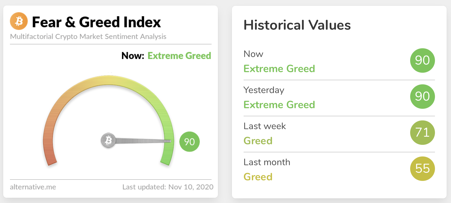 The sentiment is still in Extreme Greed at 90. Extreme fear can indicate that investors are getting too worried and there’s an opportunity for buyers, while extreme greed could mean the market is due for a correction.