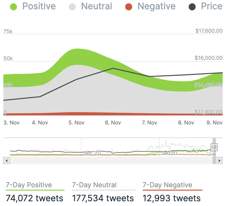 Yesterday, there were 11,600 tweets sent with a positive connotation towards bitcoin, 26,062 with a neutral connotation, and 1,764 were negative.