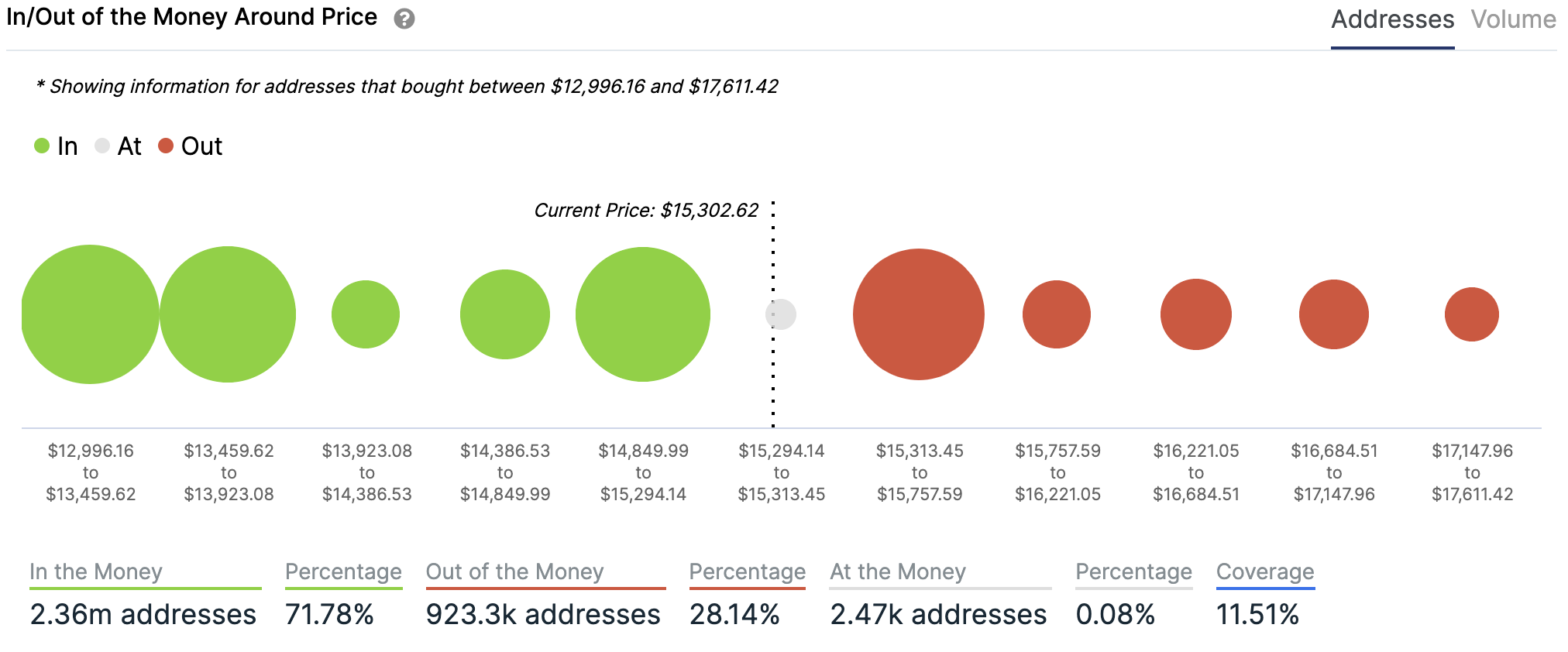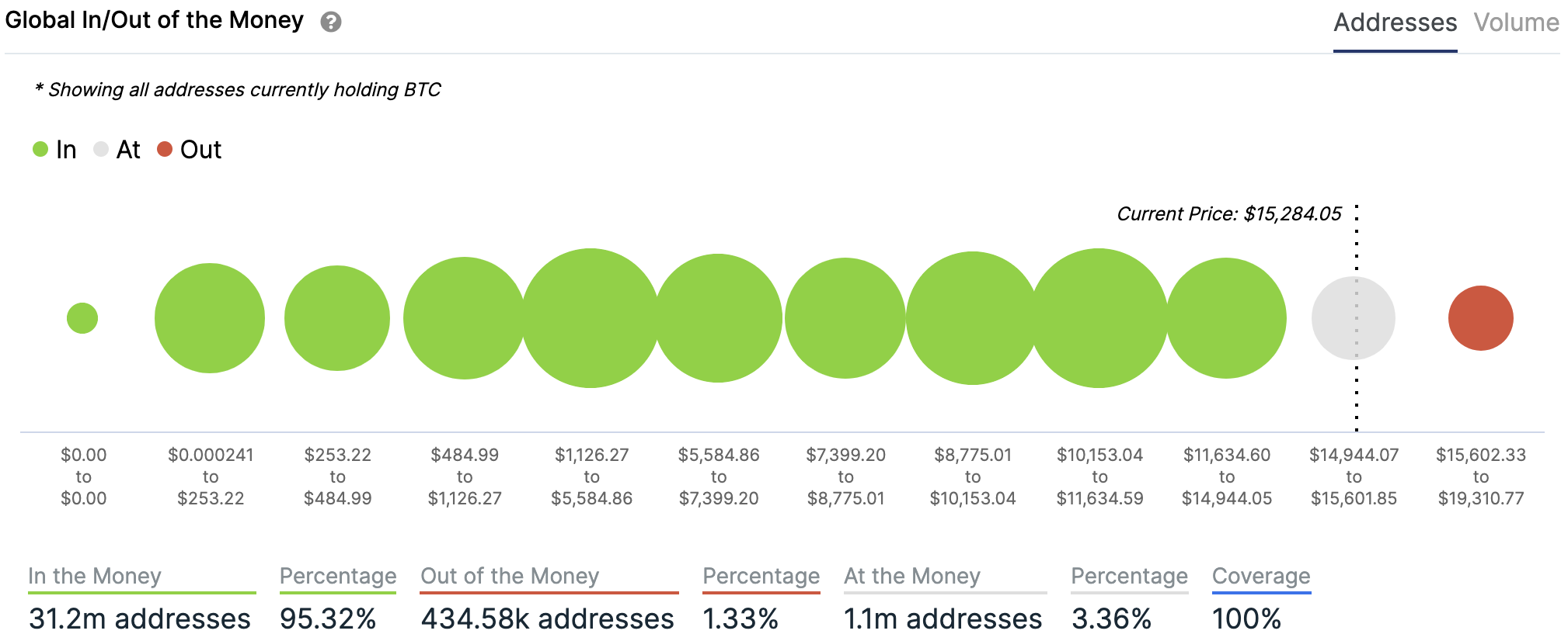For any address with a balance of tokens, ITB identifies the average price (cost) at which those tokens were purchased and compares it with the current price. If the current price is higher than average cost, address is ‘In the Money’. If the current price is lower than the average cost, the address is ‘Out of the Money’.