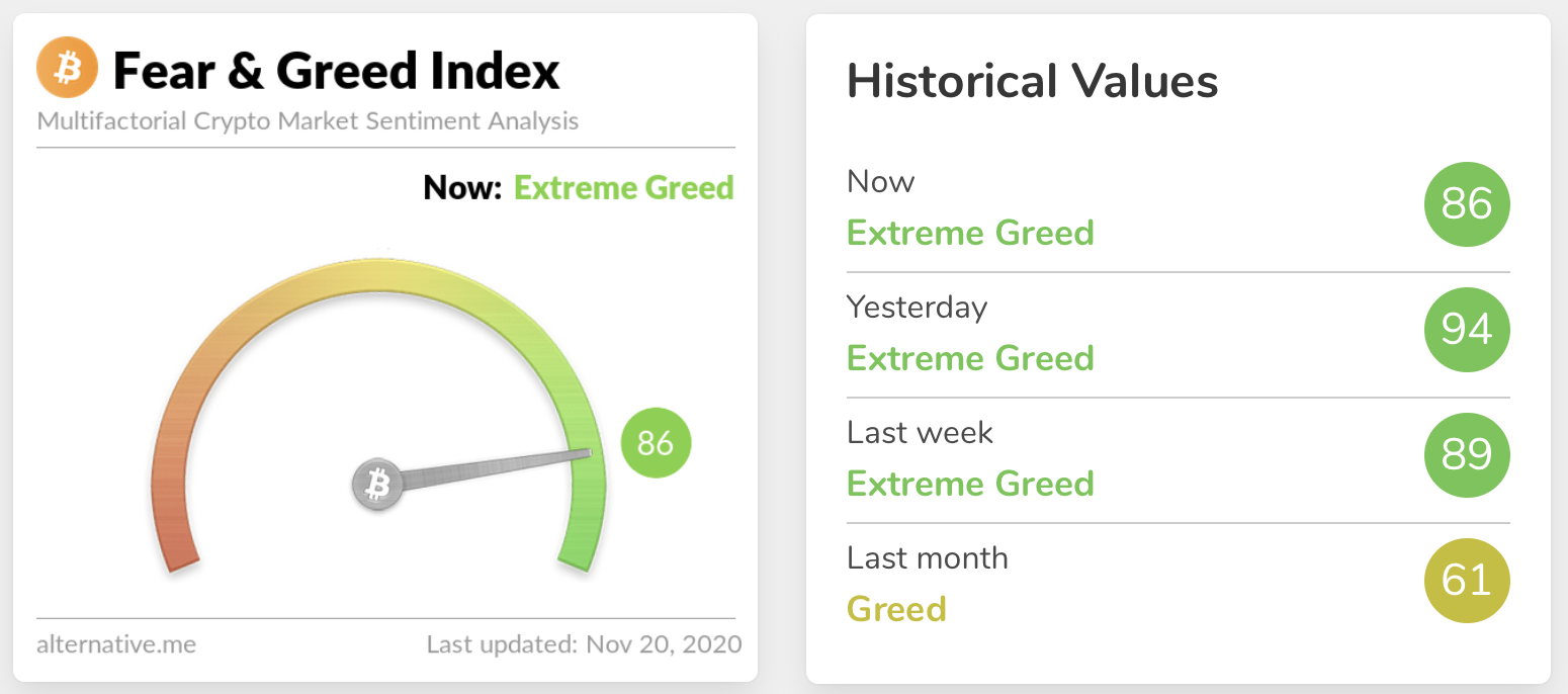 The sentiment is still in Extreme Greed again at 86 today. This is a record length of time that the index has spent in greed and it’s important to note that the index doesn’t stay this high very often, so a pullback would not be surprising. Equally, the index has only been around since 2018 and this bull run has already exhibited some curious behaviours in comparison with those in the past.
