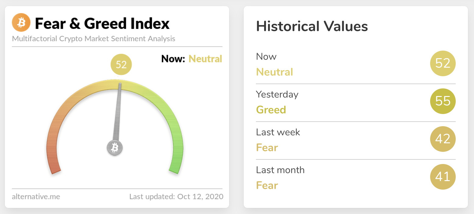 Sentiment is at 52 – down from 55 the day before. It’s the third day in a row we’ve been back over 50 – still not approaching August’s spell in Extreme Greed but certainly suggesting upward momentum. Extreme fear can be a sign that investors are too worried, which could be a buying opportunity. When Investors are getting too greedy, that means the market may be due for a correction. Are we set for a big move?