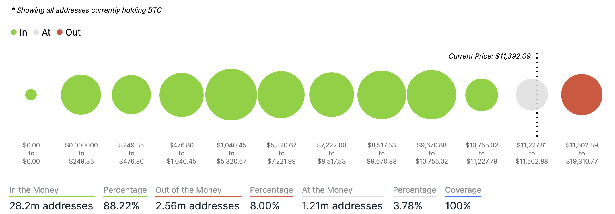 For any address with a balance of tokens, ITB identifies the average price (cost) at which those tokens were purchased and compares it with the current price. If the current price is higher than average cost, address is ‘In the Money’. If the current price is lower than the average cost, the address is ‘Out of the Money’.