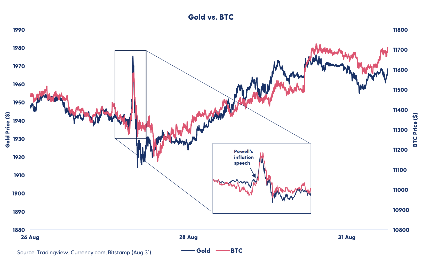 Last Thursday, the Federal Reserve announced that it’s willing to allow inflation to increase more than normal. These changes are a major policy shift. Gold, the traditional inflation hedge, spiked on the announcement, but retraced sharply after a few minutes. More notably, the bitcoin price followed the exact same pattern.