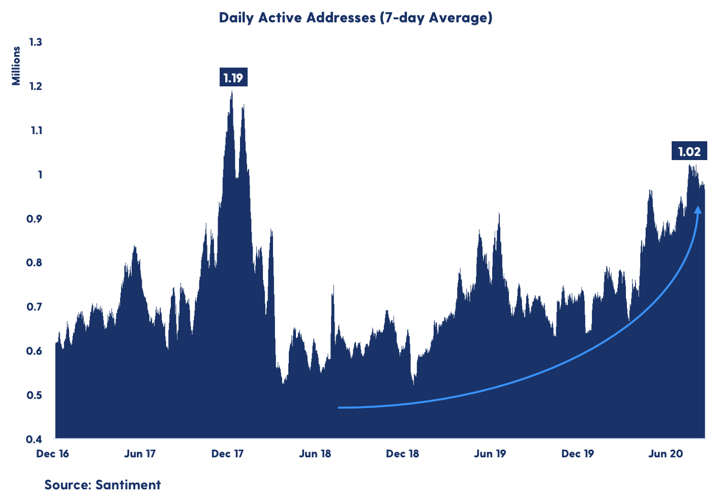 Daily active addresses on the Bitcoin blockchain have increased steadily over the past two years, according to data from Santiment. This month, the activity on the Bitcoin network was back to levels not seen since January 2018. Over 1 million daily active addresses, based on a weekly average, were registered in the beginning of August.