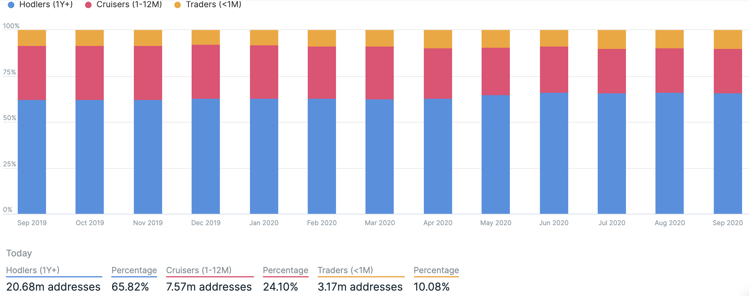 Hodlers are passive investors who have held Bitcoin for more than a year. Cruisers have held their crypto for 1-12 months, while traders have held theirs for less than 30 days. The stack bar shows the composition of holders by their holding period at the end of each calendar month.