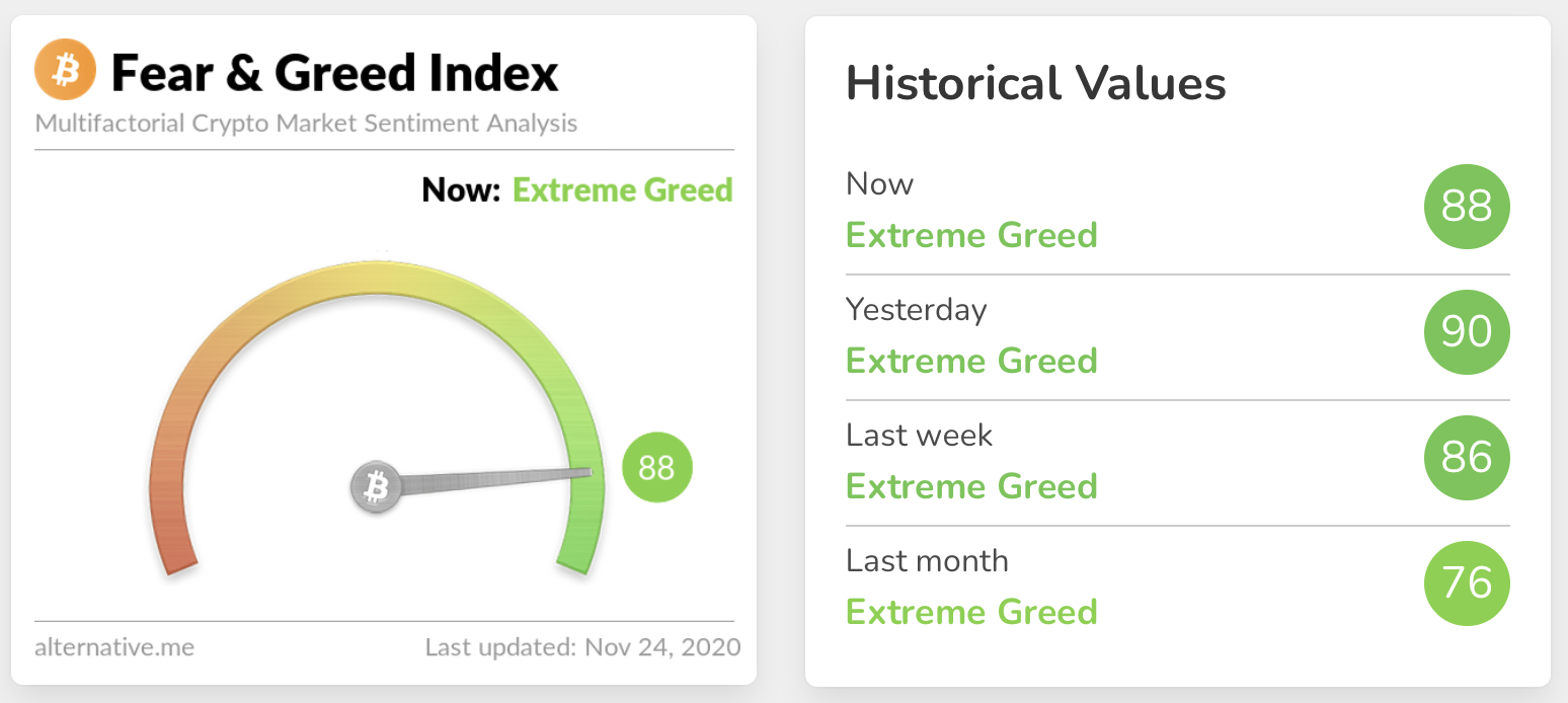 The sentiment is still in Extreme Greed at 88. The last time it was below 80 was 5 November. The index has now spent a record length of time in Extreme Greed and it’s important to note that the index doesn’t stay this high very often and a correction could be on the cards.