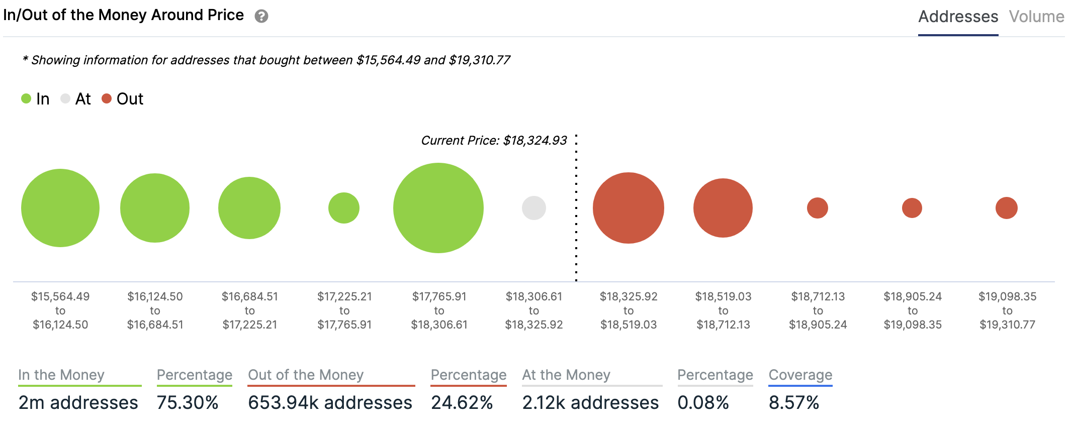 For any address with a balance of tokens, ITB identifies the average price (cost) at which those tokens were purchased and compares it with the current price. If the current price is higher than average cost, address is ‘In the Money’. If the current price is lower than the average cost, the address is ‘Out of the Money’.