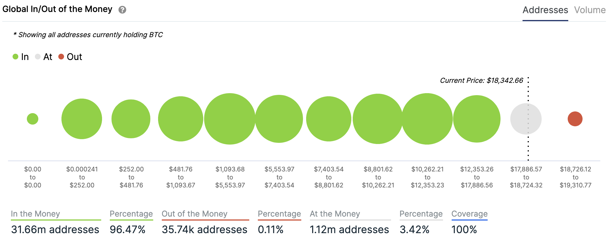 For any address with a balance of tokens, ITB identifies the average price (cost) at which those tokens were purchased and compares it with the current price. If the current price is higher than average cost, address is ‘In the Money’. If the current price is lower than the average cost, the address is ‘Out of the Money’.