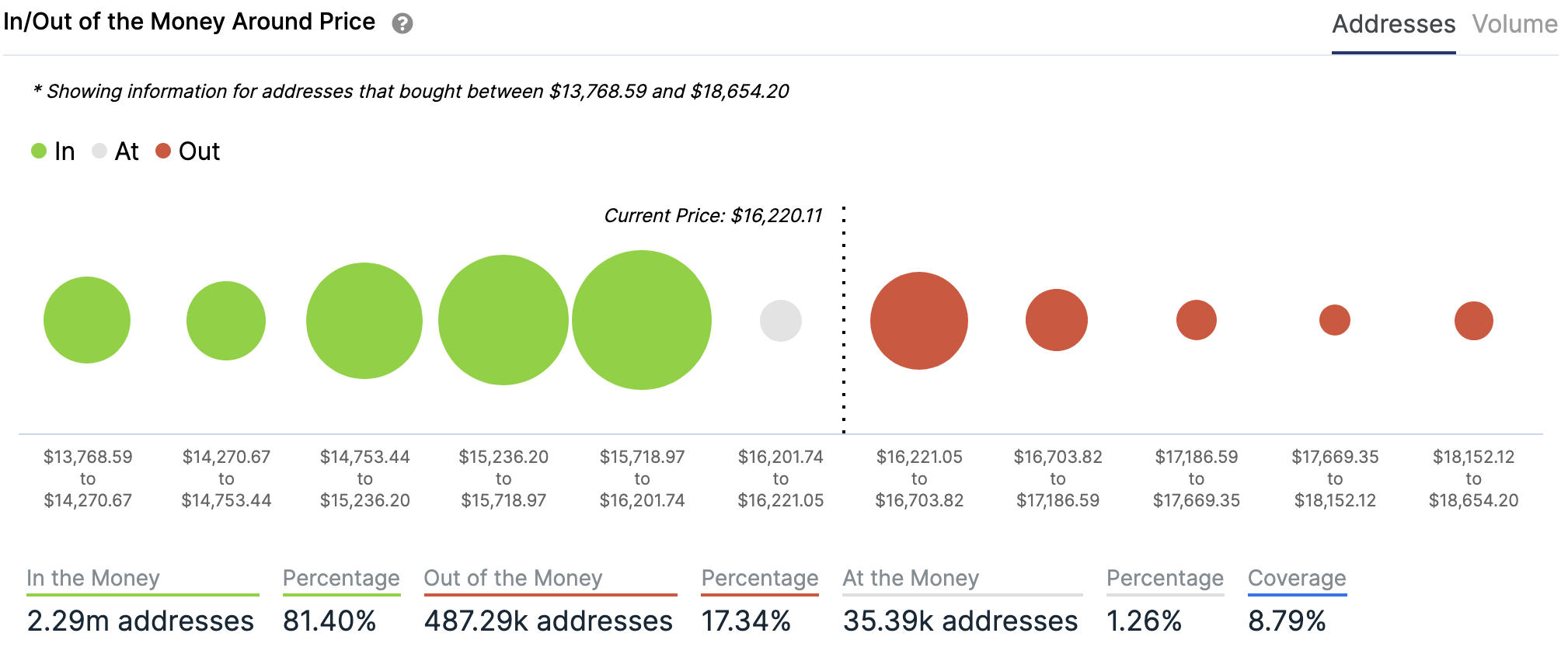 For any address with a balance of tokens, ITB identifies the average price (cost) at which those tokens were purchased and compares it with the current price. If the current price is higher than average cost, address is ‘In the Money’. If the current price is lower than the average cost, the address is ‘Out of the Money’.