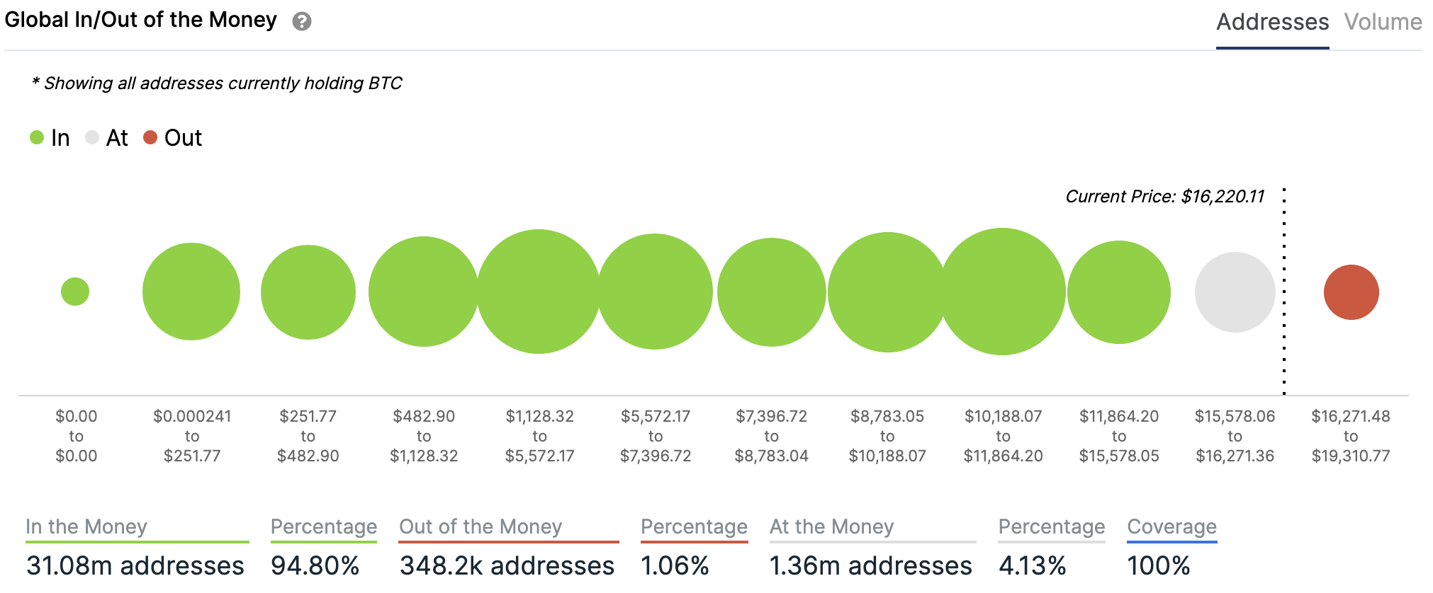 For any address with a balance of tokens, ITB identifies the average price (cost) at which those tokens were purchased and compares it with the current price. If the current price is higher than average cost, address is ‘In the Money’. If the current price is lower than the average cost, the address is ‘Out of the Money’.