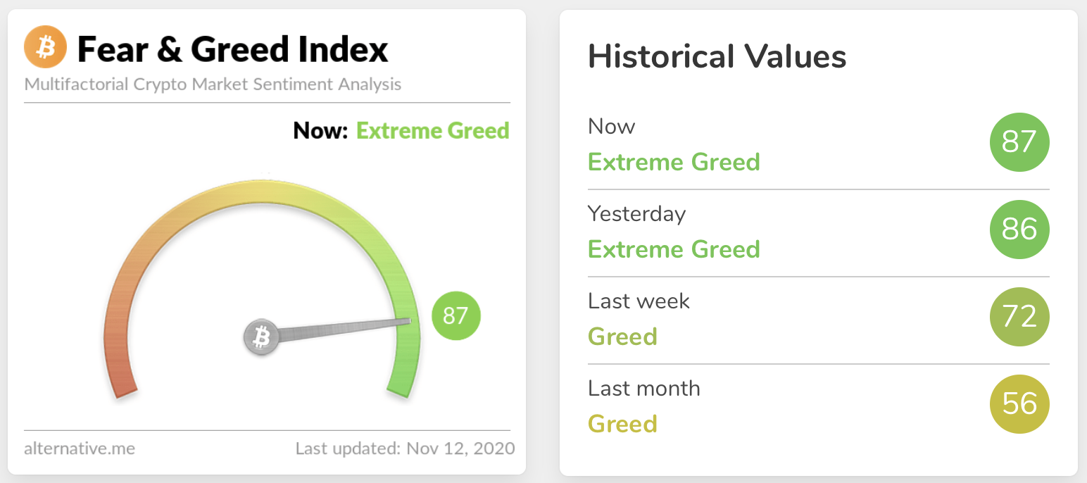 The sentiment is still in Extreme Greed, up a bit to 87 from 86. Extreme fear can indicate that investors are getting too worried and there’s an opportunity for buyers, while extreme greed could mean the market is due for a correction.
