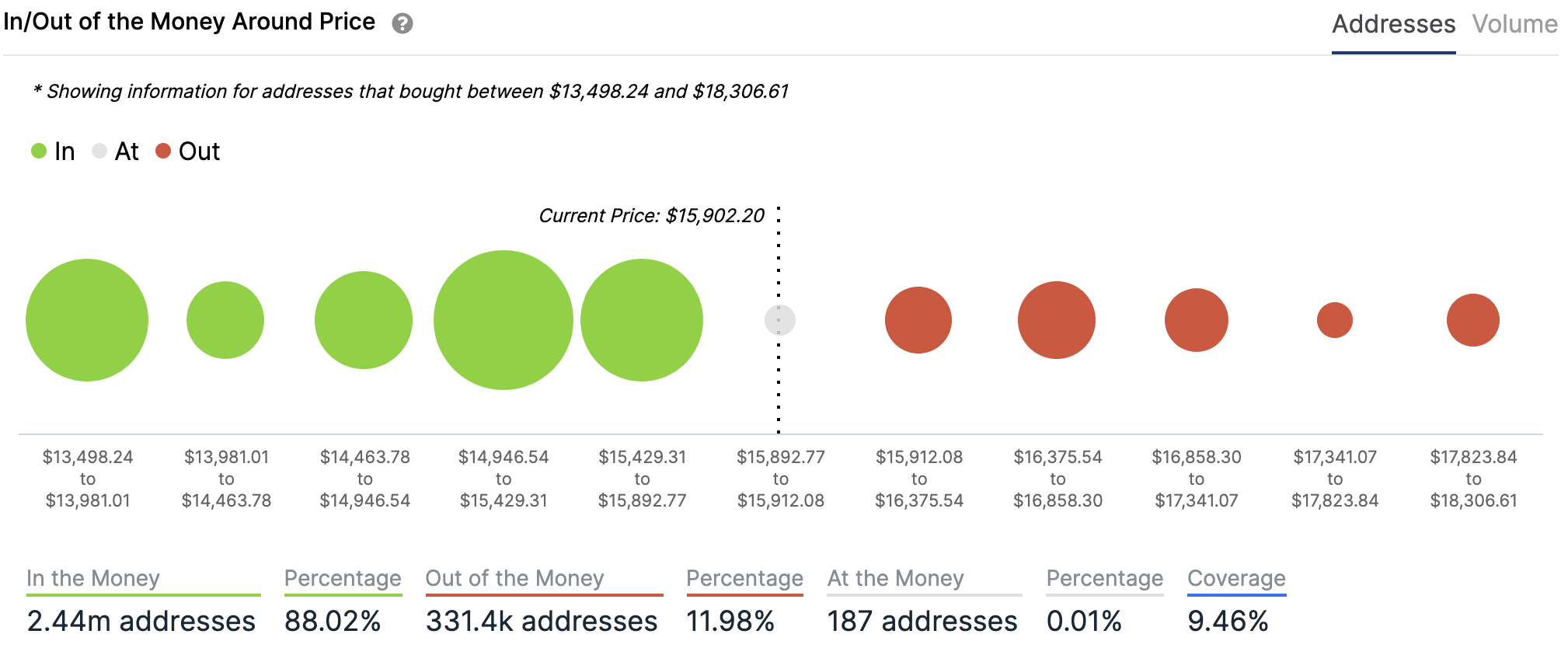 For any address with a balance of tokens, ITB identifies the average price (cost) at which those tokens were purchased and compares it with the current price. If the current price is higher than average cost, address is ‘In the Money’. If the current price is lower than the average cost, the address is ‘Out of the Money’.