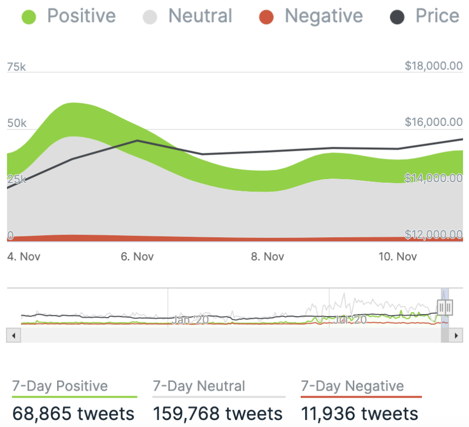 Yesterday, there were 11,107 tweets sent with a positive connotation towards bitcoin, 27,315 with a neutral connotation, and 2,080 were negative.