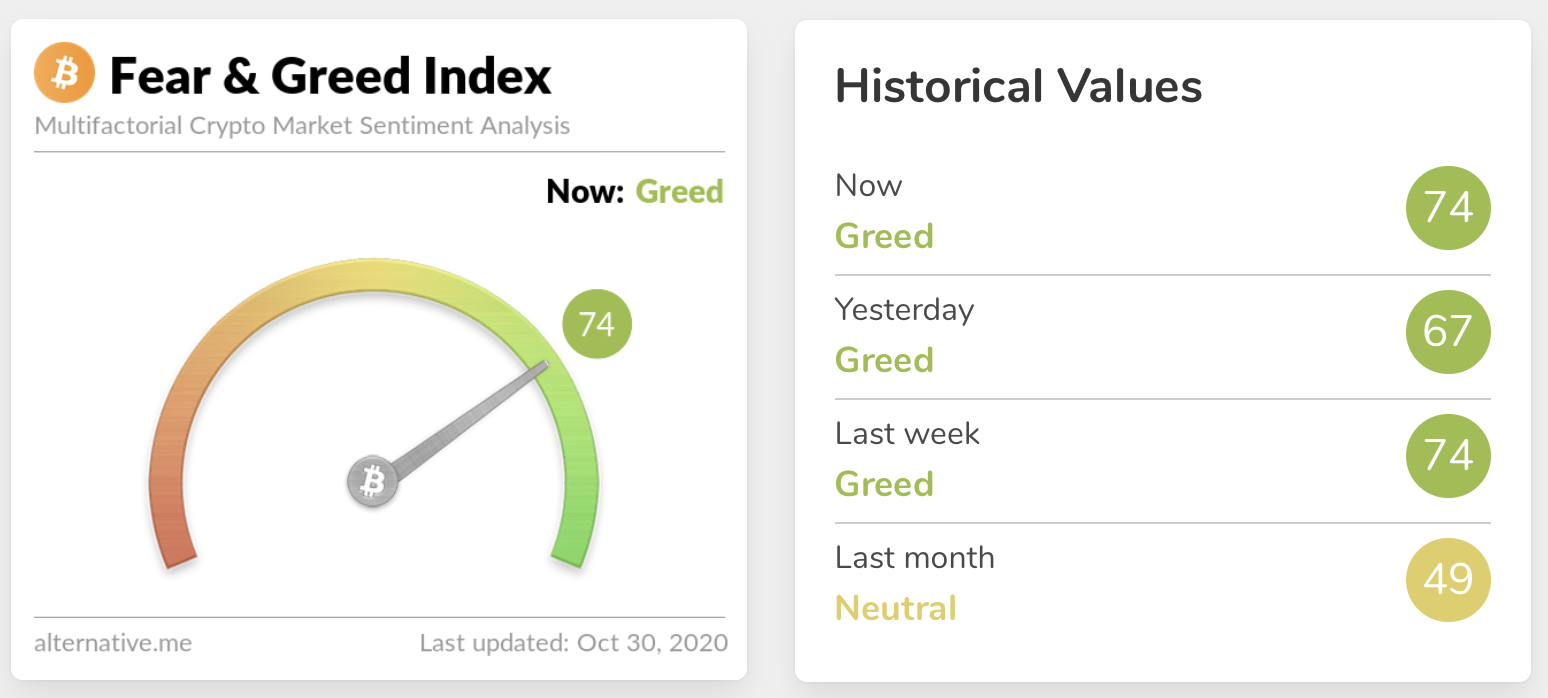 Mid 70s, how we’ve missed thee. Sentiment is back up to 74 – up from 67 the day before. Sentiment should obviously be at 100 year round because bitcoin is the best, but if we’re being technical, extreme fear can indicate that investors are getting too worried and there’s an opportunity for buyers, while extreme greed could mean the market is due for a correction.