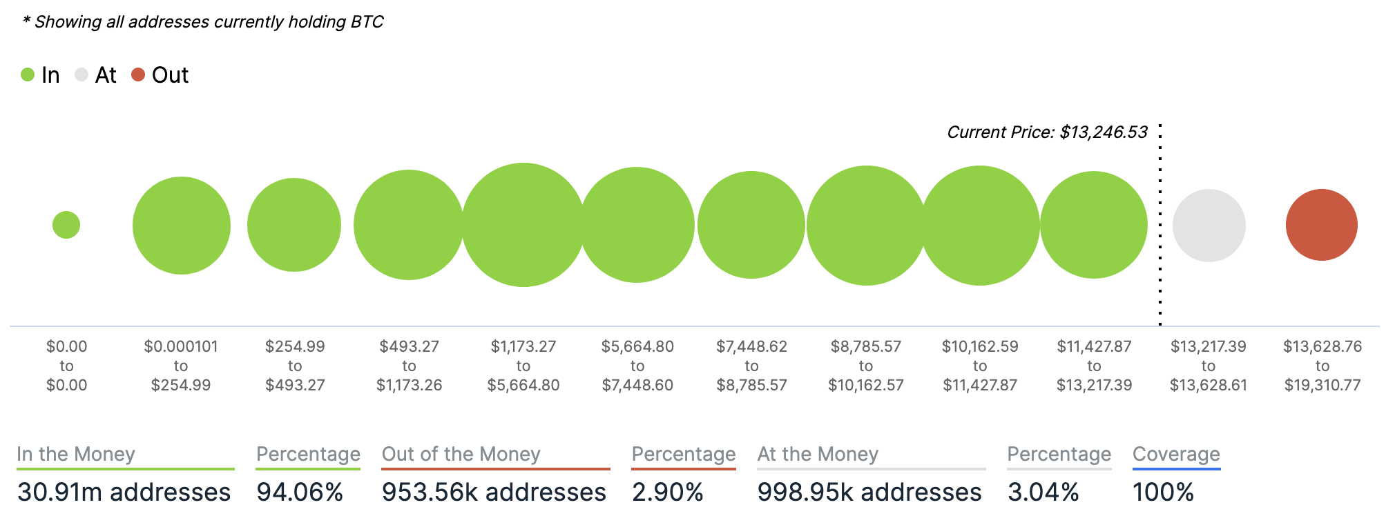 For any address with a balance of tokens, ITB identifies the average price (cost) at which those tokens were purchased and compares it with the current price. If the current price is higher than average cost, address is ‘In the Money’. If the current price is lower than the average cost, the address is ‘Out of the Money’.