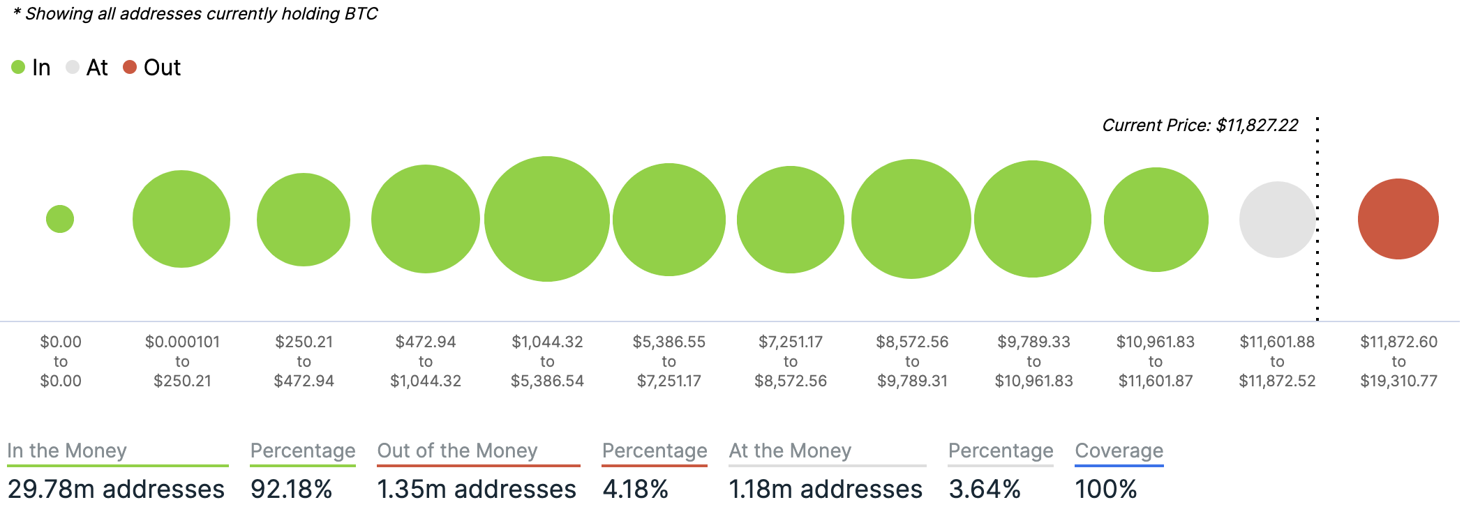 For any address with a balance of tokens, ITB identifies the average price (cost) at which those tokens were purchased and compares it with the current price. If the current price is higher than average cost, address is ‘In the Money’. If the current price is lower than the average cost, the address is ‘Out of the Money’.