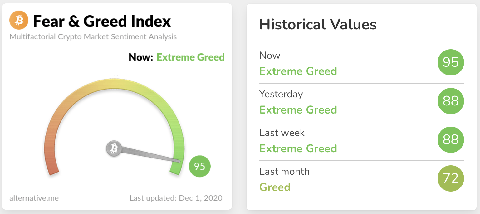 Sentiment remains in Extreme Greed at 95. That’s the joint highest recorded score since the index began. The index spent the entirety of November above 70. It’s important to note that the index doesn’t stay this high very often and a correction could be on the cards. We have been saying that a while though.