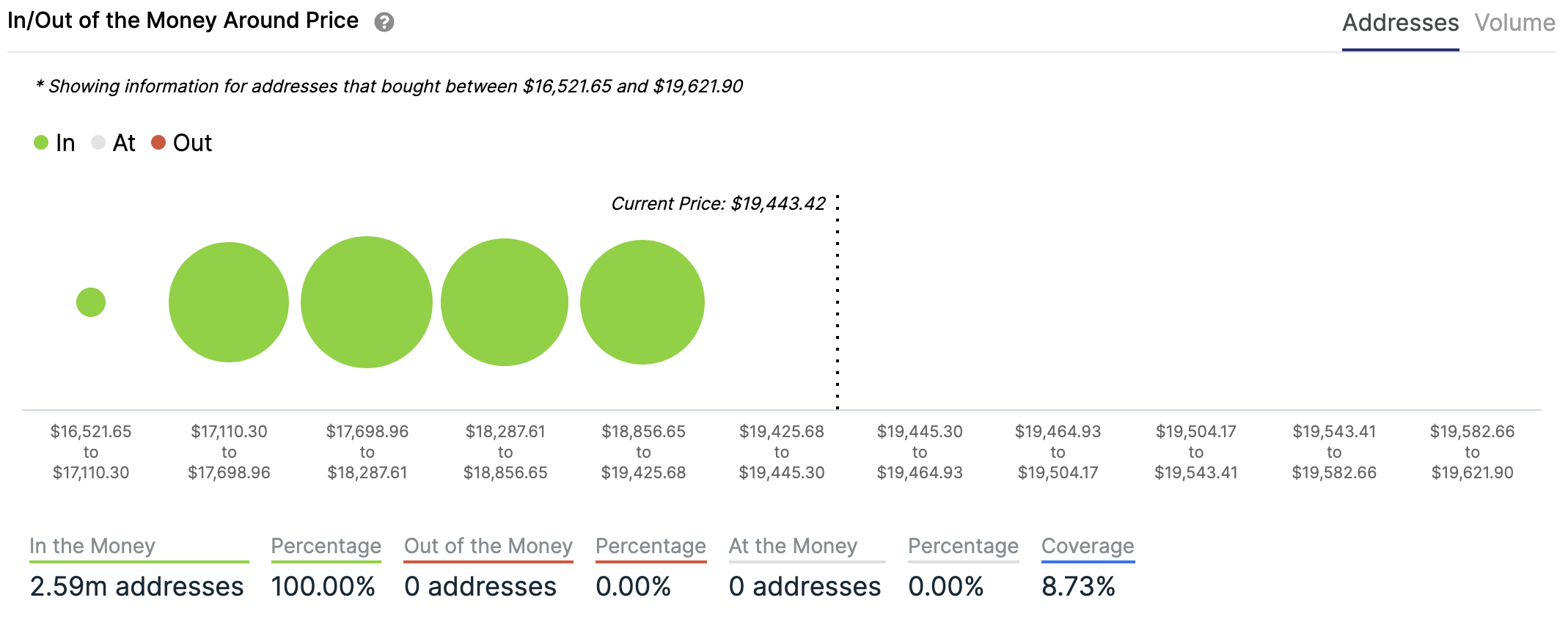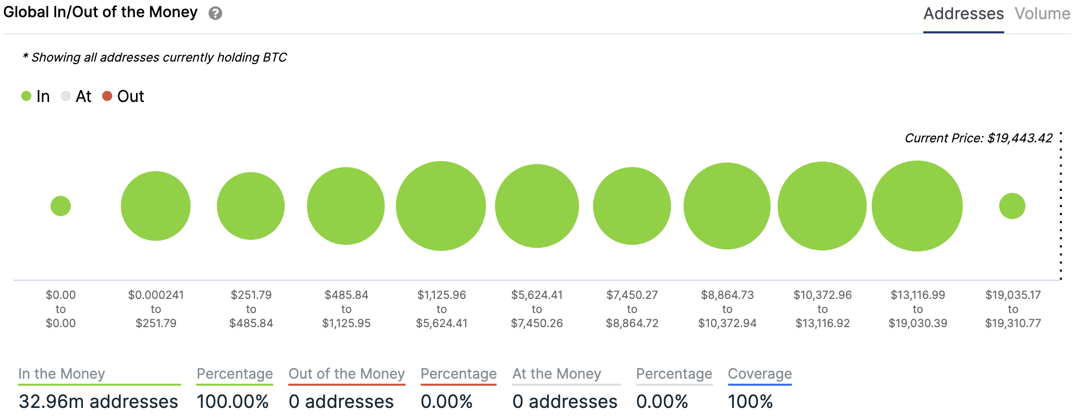 For any address with a balance of tokens, ITB identifies the average price (cost) at which those tokens were purchased and compares it with the current price. If the current price is higher than average cost, address is ‘In the Money’. If the current price is lower than the average cost, the address is ‘Out of the Money’.