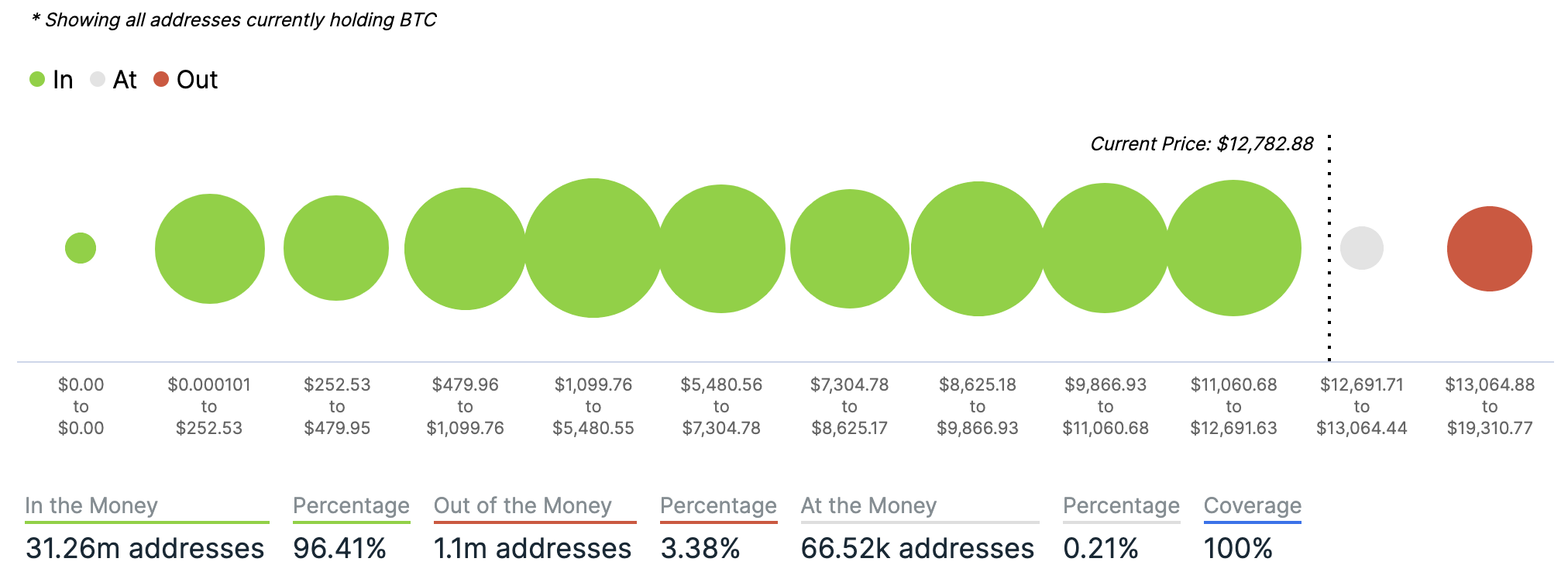 For any address with a balance of tokens, ITB identifies the average price (cost) at which those tokens were purchased and compares it with the current price. If the current price is higher than average cost, address is ‘In the Money’. If the current price is lower than the average cost, the address is ‘Out of the Money’.