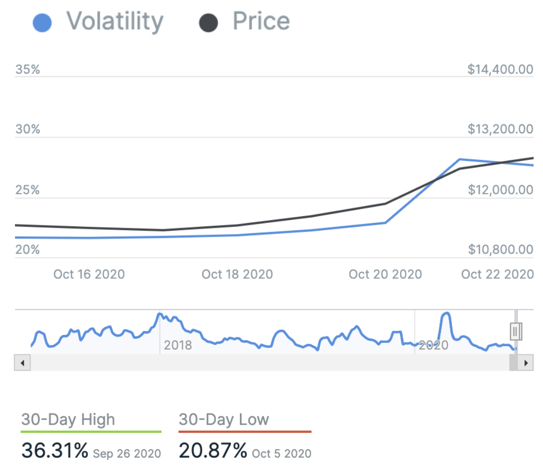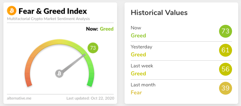 We closed yesterday, 21 October, 2020, at a price of $12,823.69, with a daily high of $13,184.57 and a low of $11,900.93. That’s the highest closing price since 26 June 2019 and the first time we’ve been over $13,000 since 27 June.
