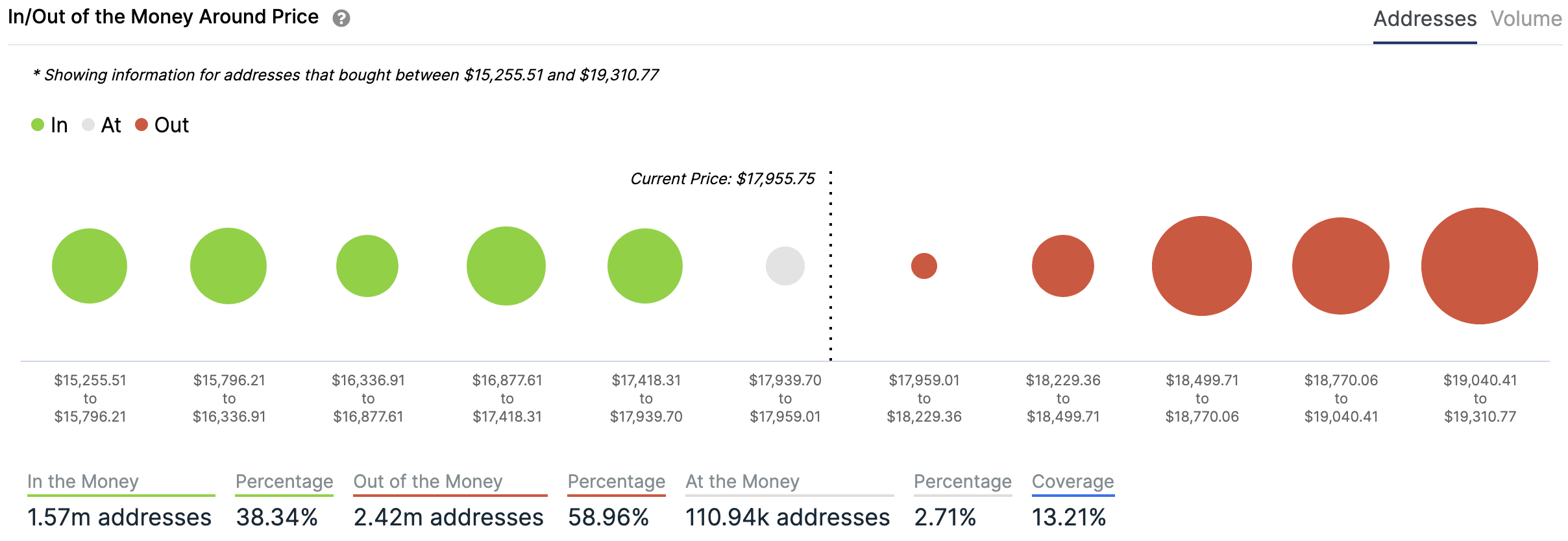 For any address with a balance of tokens, ITB identifies the average price (cost) at which those tokens were purchased and compares it with the current price. If the current price is higher than average cost, address is ‘In the Money’. If the current price is lower than the average cost, the address is ‘Out of the Money’.