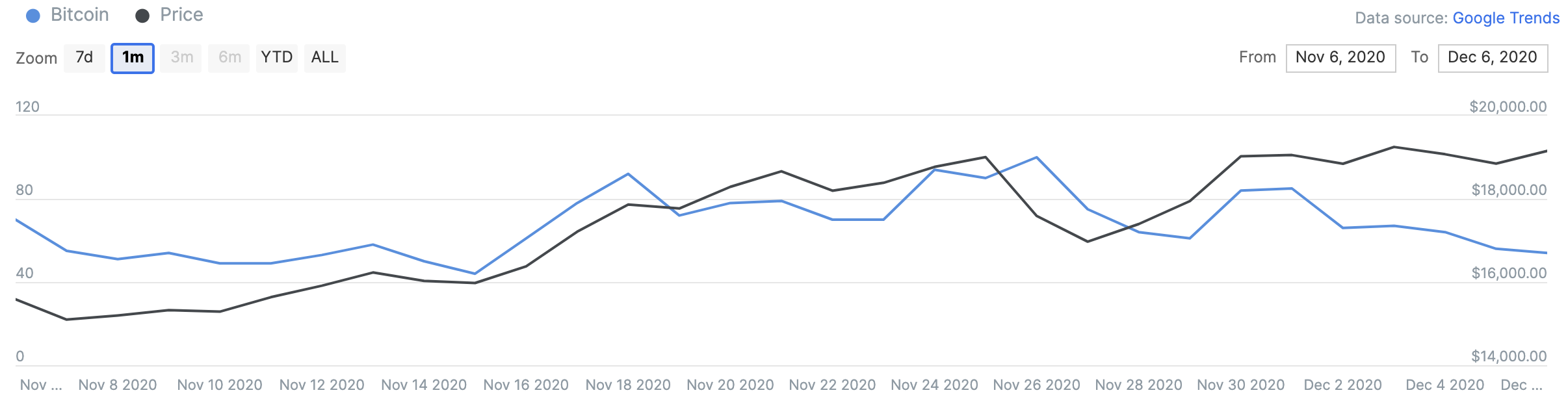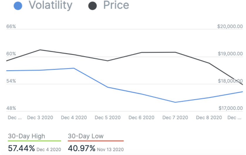 We closed yesterday, 8 December, 2020, at a price of $18,321.14 – down from $19,191.63 the day before. That’s the lowest closing price since 29 November.