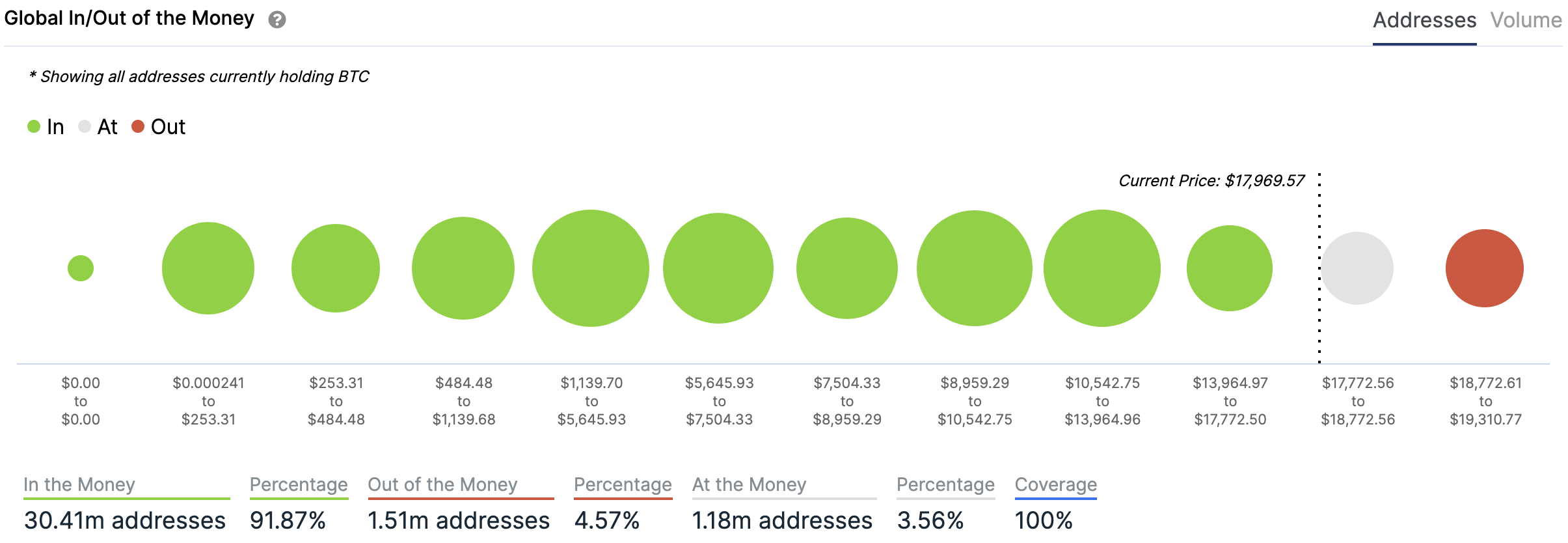 For any address with a balance of tokens, ITB identifies the average price (cost) at which those tokens were purchased and compares it with the current price. If the current price is higher than average cost, address is ‘In the Money’. If the current price is lower than the average cost, the address is ‘Out of the Money’.