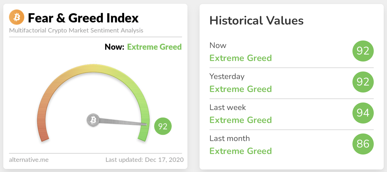 The sentiment remains in Extreme Greed territory at 92, the same as yesterday. The last time the sentiment was lower than Extreme Greed was 6 November, 2020. It’s important to remember that the index doesn’t stay this high very often and a correction could be on the cards.