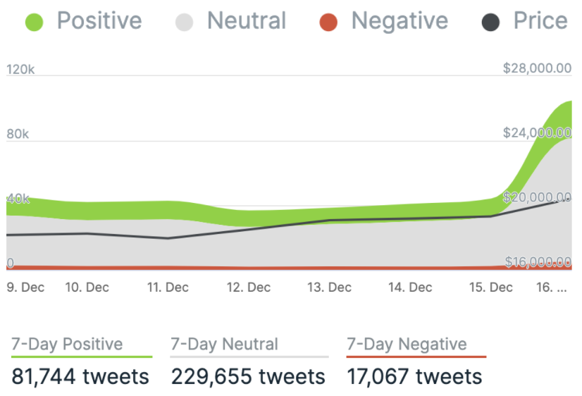 Yesterday, there were 23,260 tweets sent with a positive connotation towards bitcoin, 76,393 with a neutral connotation, and 5,136 were negative.