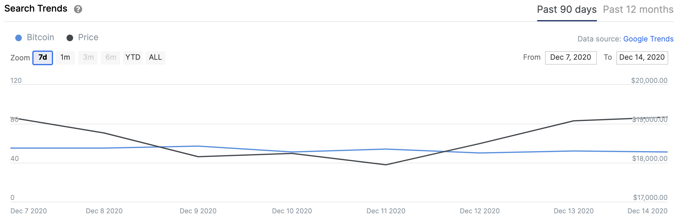 The trend in Google searches over the last 90 days. Google shows this chart on a relative basis with a max score of 100 on the day that had the most Google searches for that keyword. The latest score is 51 – taken from 14 December when the data is last collected.