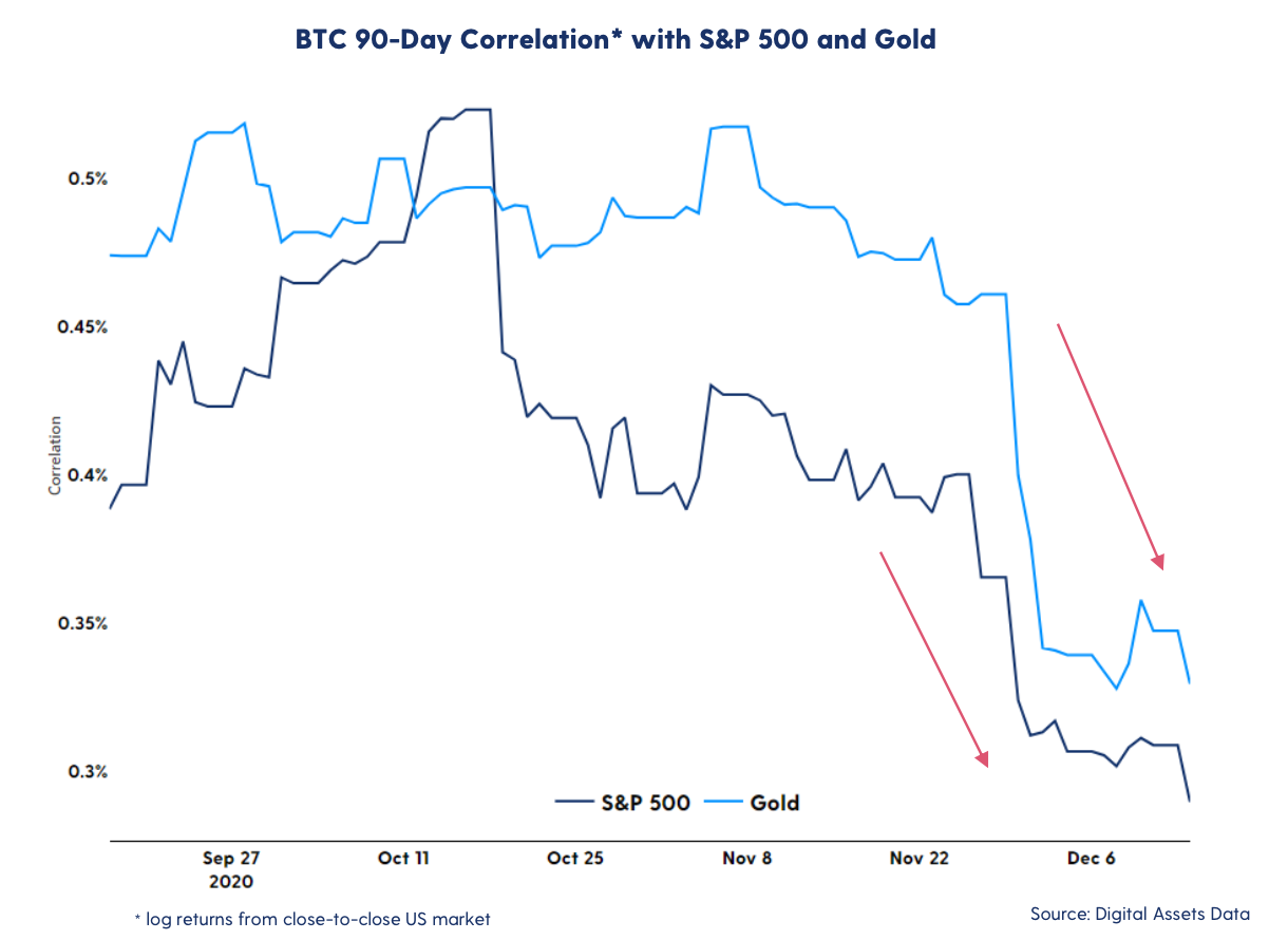 Zooming out, the correlation between bitcoin, the stock market and other asset classes appears to be decreasing. The correlation with the S&P 500 has been decreasing steadily since the beginning of October, with Bitcoin’s magnificent returns over the past months having seen it decouple from most assets. The correlation with the S&P is now the lowest since the March crash. Good news.