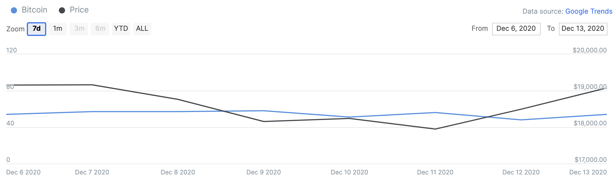 We closed yesterday, 15 December, 2020, at a price of $19,417.08 – up from $19,246.64 the day before. The price has now closed over $18,000 for 17 consecutive days.