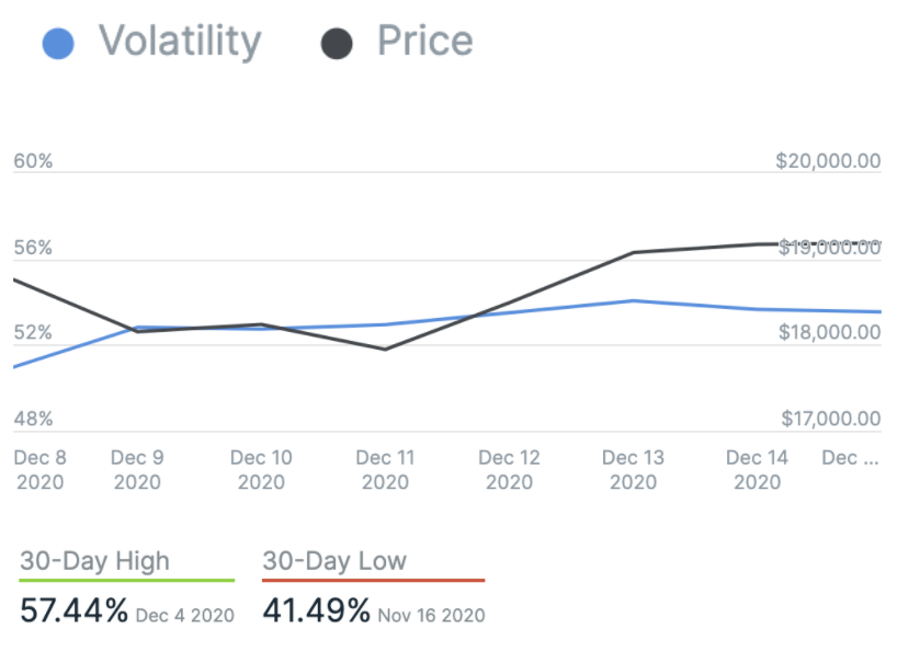 The price volatility of bitcoin over the last 30 days is 53.13%.