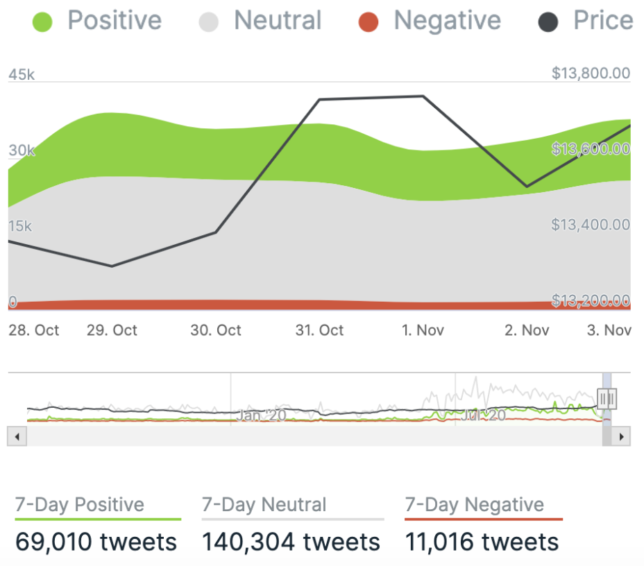 We closed yesterday, 3 November, 2020, at a price of $13,950.30 – up from 13,550.49 the day before and $13,271.29 a week ago. That’s the highest closing price since 13 January, 2018. We’ve now spent 11 consecutive daily closes above $13,000.
