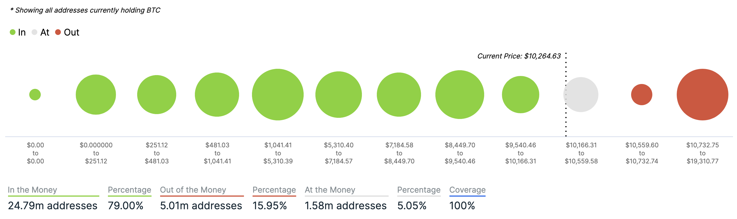 For any address with a balance of tokens, ITB identifies the average price (cost) at which those tokens were purchased and compares it with the current price. If the current price is higher than average cost, address is ‘In the Money’. If the current price is lower than the average cost, the address is ‘Out of the Money’.