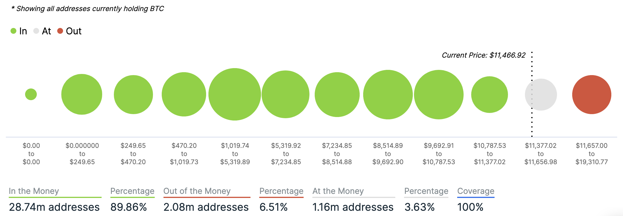 For any address with a balance of tokens, ITB identifies the average price (cost) at which those tokens were purchased and compares it with the current price. If the current price is higher than average cost, address is ‘In the Money’. If the current price is lower than the average cost, the address is ‘Out of the Money’.