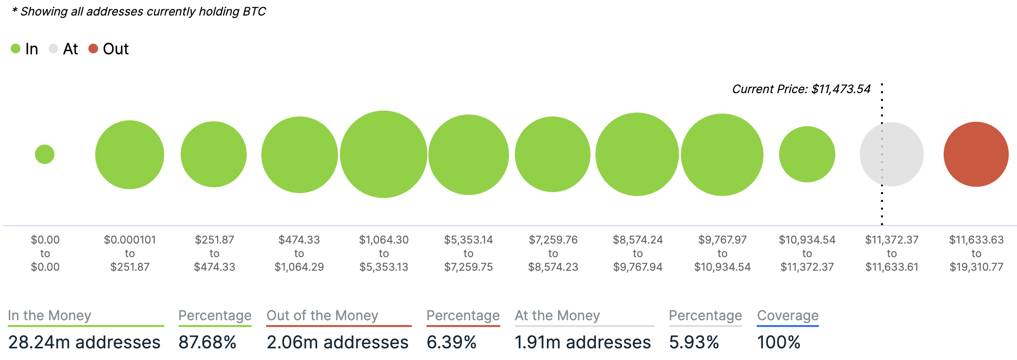 For any address with a balance of tokens, ITB identifies the average price (cost) at which those tokens were purchased and compares it with the current price. If the current price is higher than average cost, address is ‘In the Money’. If the current price is lower than the average cost, the address is ‘Out of the Money’.