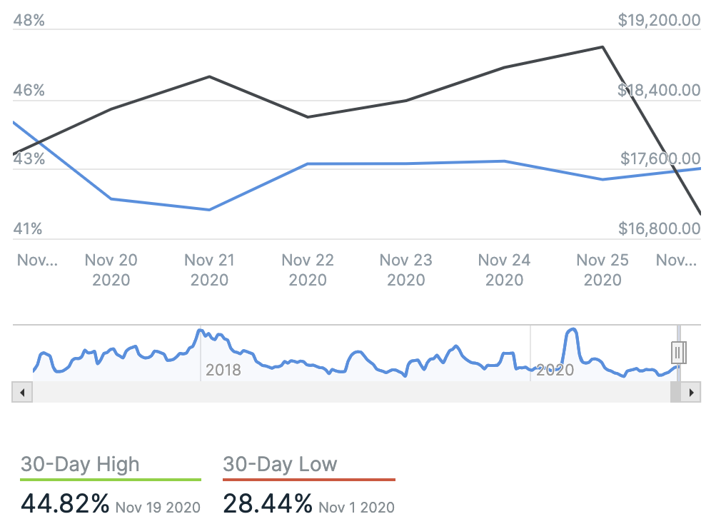 The volume traded yesterday was $43,710,357,371, down from $51,469,565,009 the day before. High volumes indicate that a significant price movement has stronger support and is more likely to be sustained. In the bull run of December-January 2018, the highest daily volume was $23,840,899,072.