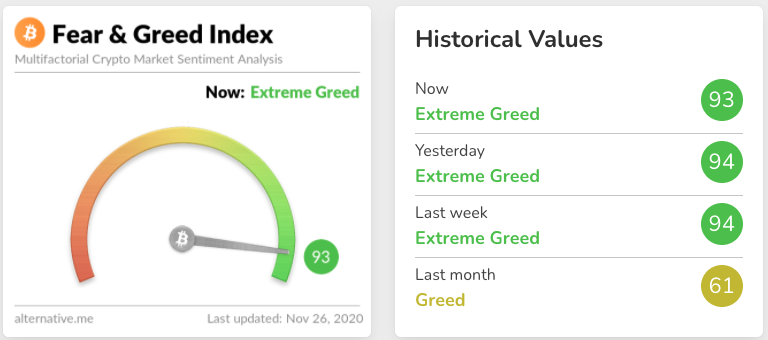 The sentiment is still in Extreme Greed at 93. The last time it was below 80 was 5 November. The index has only been higher once, when it touched 95 last summer. The index has now spent a record length of time in Extreme Greed and it’s important to note that the index doesn’t stay this high very often.