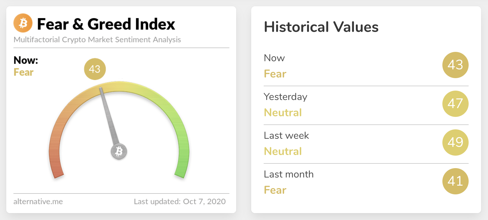 Sentiment is at 43 – down from 47 yesterday. Extreme fear can be a sign that investors are too worried, which could be a buying opportunity. When Investors are getting too greedy, that means the market may be due for a correction. Are we set for a big move?