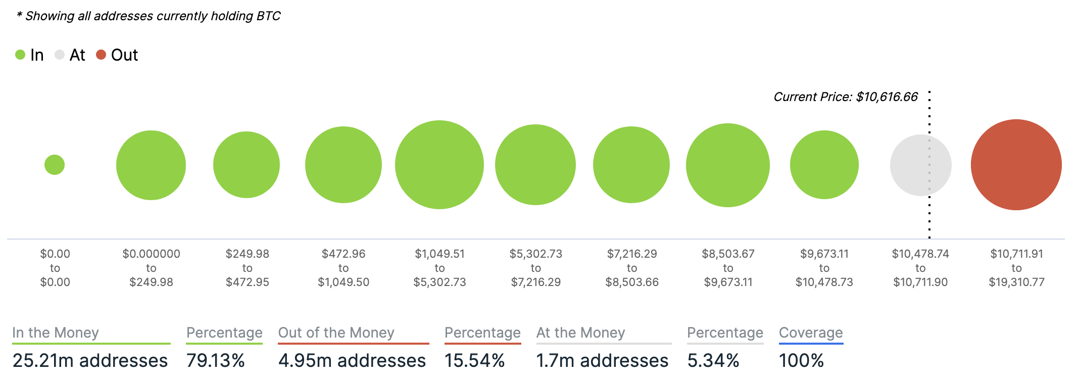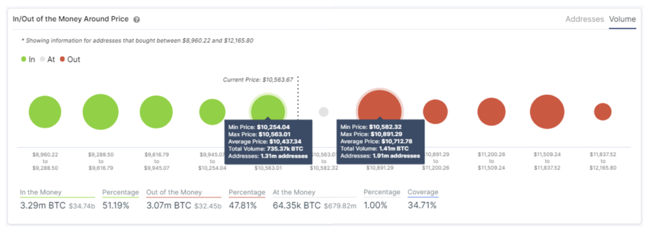 Here, we can see that over 735,000 BTC was purchased by 1.31 million addresses between $10,254 and $10,563. This is expected to (and has been) an area of strong support as there will be buying pressure from holders to sustain this key range.