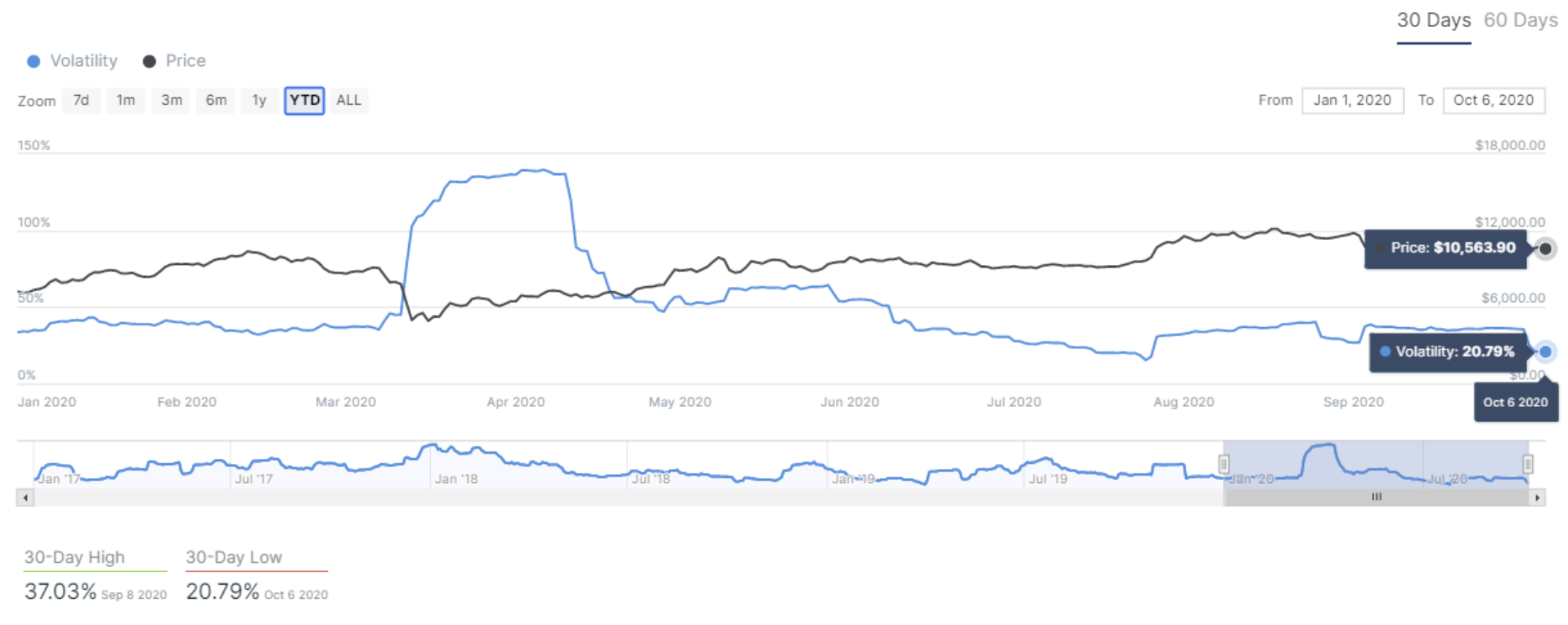 As can be seen in the graph above, it’s clear that bitcoin has been more stable recently – with its 30-day volatility dipping below 21%. This is a result of bitcoin hovering around the $10,000 level for approximately 72 days.