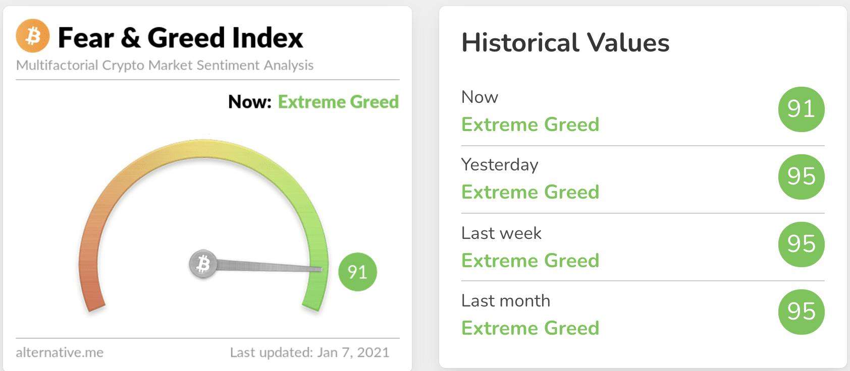 Unsurprisingly, the sentiment remains in Extreme Greed territory but has fallen to 91, down from 95 yesterday. That’s the lowest it’s been since 30 December, 2020. The last time the sentiment was not in Extreme Greed was 5 November, 2020.