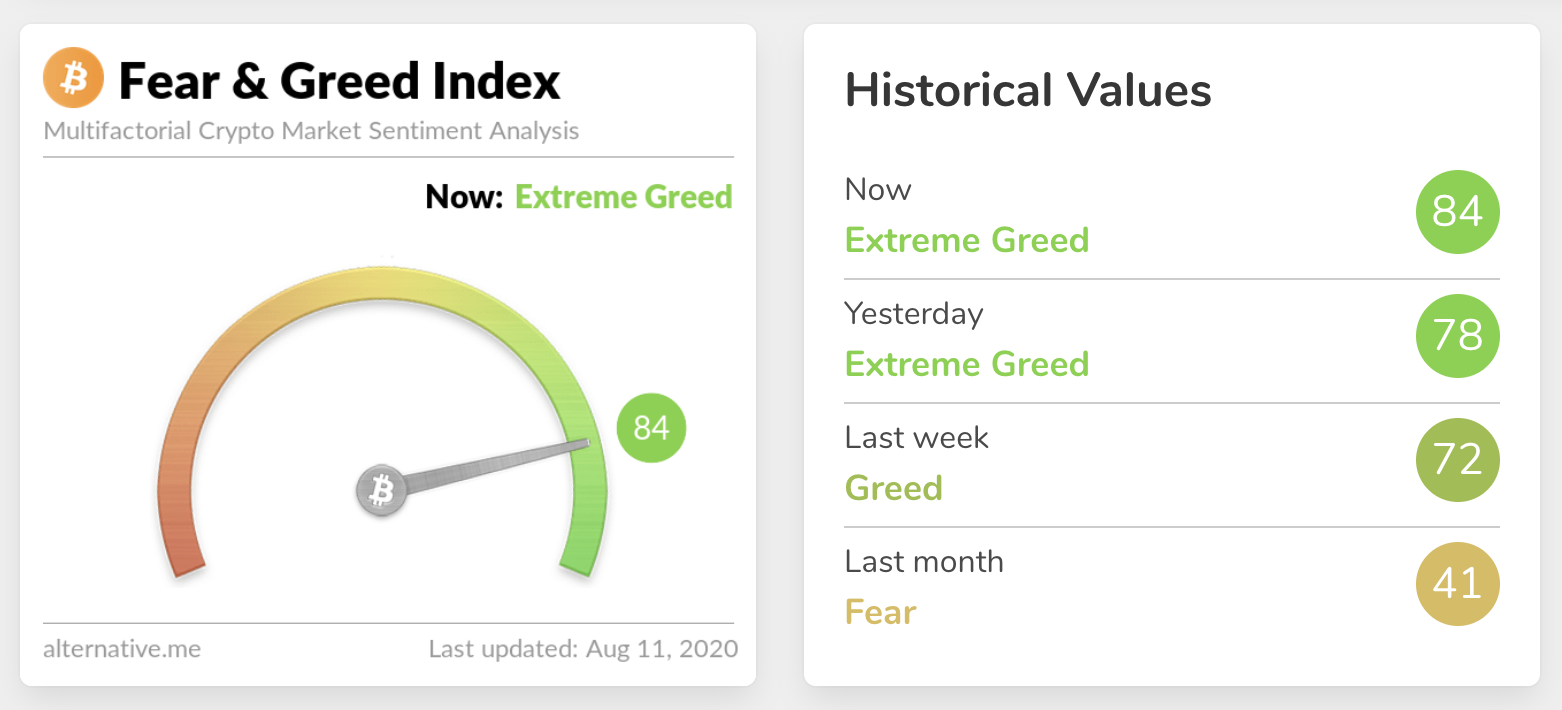 The Fear & Greed Index measures emotions and sentiment in the cryptocurrency market. Yesterday closed in the Extreme Greed zone, rising to 84 yesterday – the highest it’s been since 9 July 2019. Extreme fear could be a sign that investors are too worried, which could be a buying opportunity. When Investors are getting too greedy, that means the market may be due for a correction.